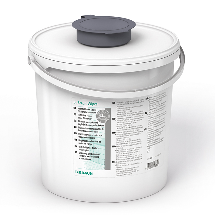 Bei dem Wipes Spendersystem handelt es sich um einen nachfüllbaren Vliestuchspender zum Befüllen mit ca. 2,5 Ltr. Desinfektionsmittellösung. Zur optischen Unterscheidbarkeit verschiedener eingefüllter Produkte stehen Etiketten in den Farben rot, blau und grün zur Verfügung. Folgende B. Braun Produkte sind mit dem B. Braun Wipes Spendersystem geprüft: Hexaquart pure, Hexaquart XL, Hexaquart plus lemon fresh, Melsept SF, Meliseptol, Meliseptol rapid, Meliseptol Foam pure.